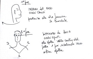 L’esercizio è molto semplice, si parte da un lato (destro per le femmine e sinistro per i maschi) e con gli occhi chiusi si inspira dal naso girandosi dall’altro lato. Quindi si aprono gli occhi e buttando fuori l’aria dalla bocca (soffiando) si va con il mento verso il petto e poi si ricomincia l’esercizio.