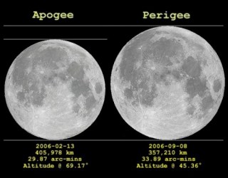 Oggi la giornata è di perigeo lunare, così come avevamo già osservato nel 6 maggio ma la fase di completamento del plenilunio sarà di domani quindi abbiamo una leggera differenza. Per comprendere la differenza di distanza basti vedere questa foto: