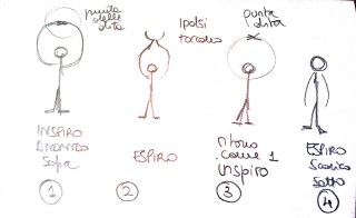 Parto con le braccia in basso (posizione 4) quindi inspirando sollevo le braccia verso l’alto disegnando un cerchio ideale, unendo la punta delle dita. Quindi inspiro e tocco i polsi ed inspiro ritornando nella posizione 1 per espirare tornando nella posizione di partenza che è anche di chiusura (4). Il movimento è lento, consiglio di fare l’esercizio la sera, di giorno non mi sembra che sia molto indicato.