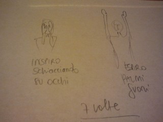 Inspira schiacciando leggermente con il palmo della mano contro gli occhi e poi espira buttando fuori le mani con i palmi davanti a te (pollici in dentro).