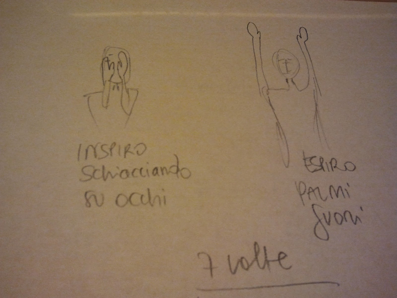 Copri con le mani metà labbro destro con la mano destra e l’altra metà sinistra con la mano sinistra. Inspirando dal naso. Quindi espira buttando le braccia sotto con il palmi fuori ovvero girati come te (pollici esterni o fuori da te).