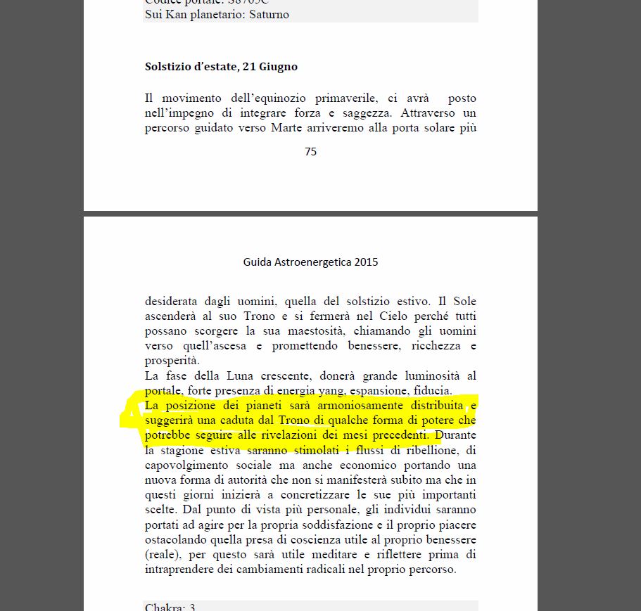 Come potrete vedere nella parte evidenziata si parla di “Caduta dal trono”, in un certo senso inevitabile, complementare a quel movimento di ribellione che in questo momento (come più volte ho sottolineato) sta rafforzando la sua portata. Il panorama internazionale è sicuramente complesso e non è semplice intravedere qualcosa di positivo nei movimenti di violenza e di inganni a cui l’umanità è da sempre soggiogata ma che oggi hanno una portata sul mentale impressionante. Tuttavia questo, può dare speranza a un risveglio personale, in grado di riportare ordine o per meglio dire naturalezza.